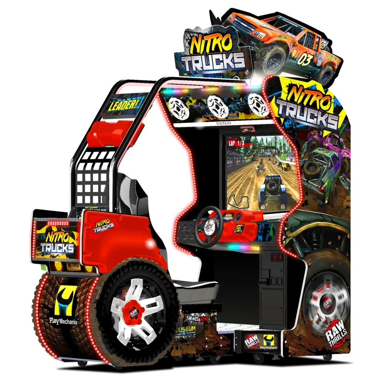 Smash your way to victory in Nitro Trucks® – a rowdy 1 on 1 competition game Pick up power-ups to repair your vehicle and earn nitro boosts – then hit the RAM button to show your opponents who’s boss! An immersive design puts you in the driver’s seat – complete with a roll cage, 5.1 surround sound speakers, LED lighting, and a force-feedback steering wheel. This game is big, beautiful, and a must-have for your next event.