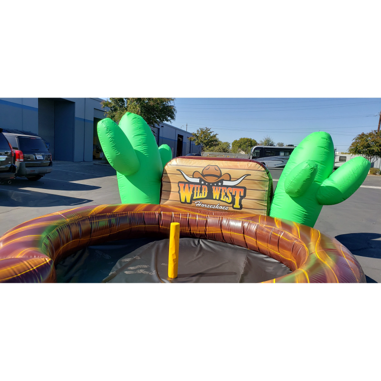 Size x 4' W x 8' L x H Inflatable giant horseshoes are large inflatable horseshoes that are designed to be used as a fun game for children and adults alike. The game involves throwing the inflatable horseshoes at a target, with the goal of getting the horseshoe to land closest to the target. The game can be played indoors or outdoors, and is a great way to get some exercise and have fun with friends and family. Power 1 outlet