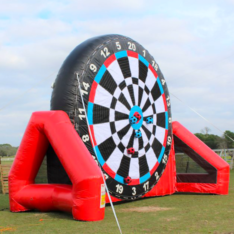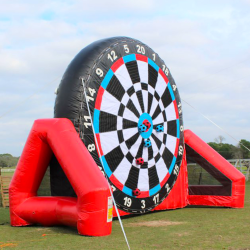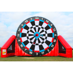 Experience the thrill of our innovative Soccer Dart game, where players kick a sticky soccer ball onto a massive inflatable dartboard to aim for high scores. This inflatable features a point system similar to traditional darts, adding a unique twist to the game. Each set includes three soccer dart balls for hours of fun and competition. Take your soccer skills to the next level and challenge your friends to a game of Soccer Dart today!