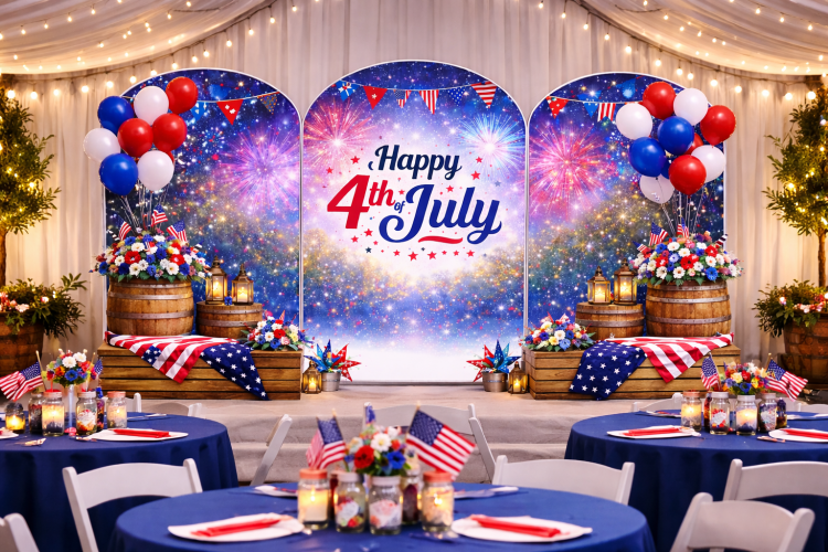 The display includes three arched panels framed by festive Americana décor: red, white, and blue balloon clusters, rustic wooden crates and barrels, lanterns, patriotic florals, bunting, and draped American flags. The layered textures and glowing details give this backdrop a warm, celebratory feel that works beautifully for both daytime and evening events.